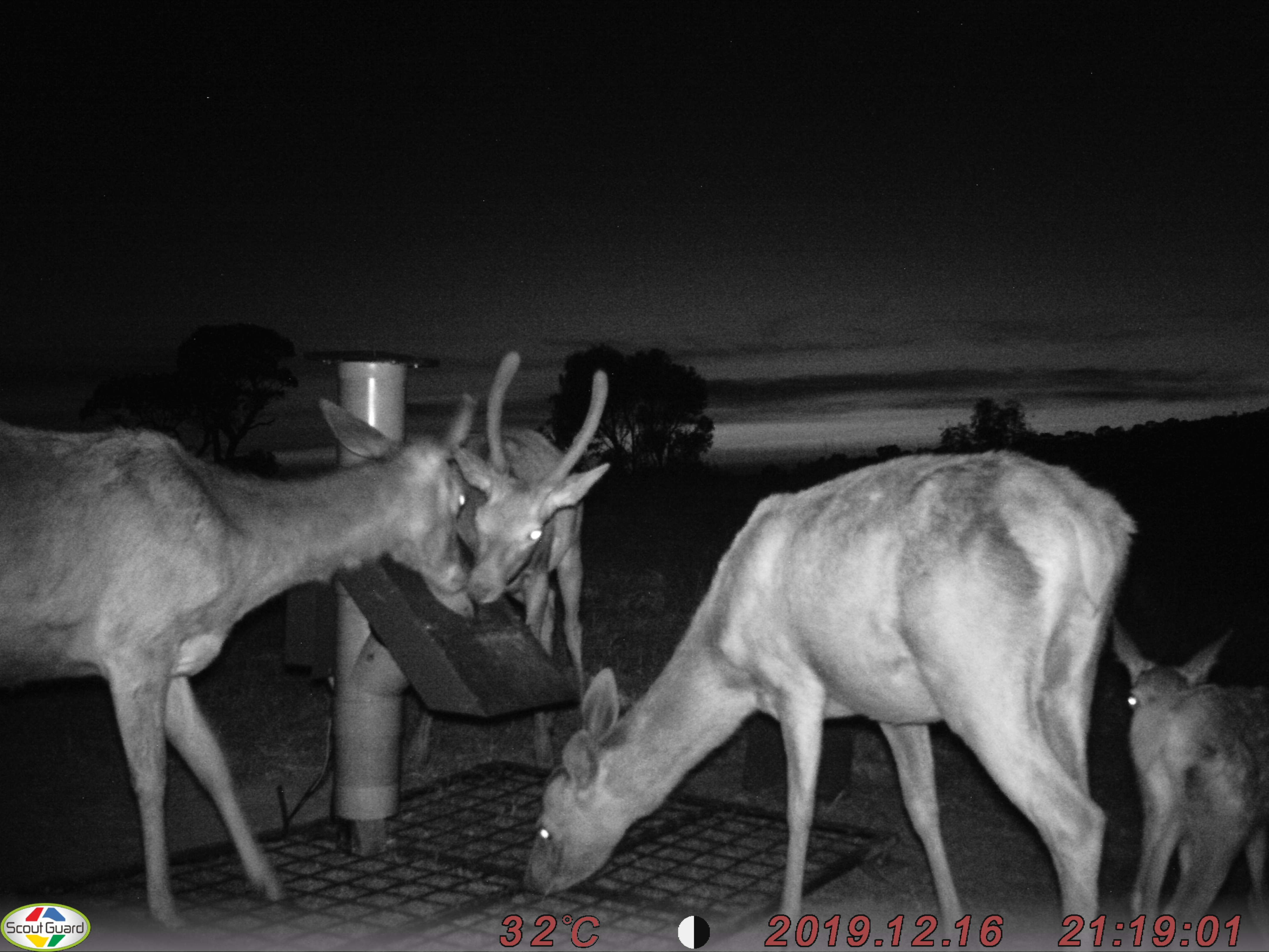 The system can be set up to automatically shut before sunrise to prevent birds accessing the food. The system has been designed to shut when the long feet of kangaroos or wallabies walk on the grid. However, the stiletto-like hooves of deer fit through the grid, allowing them to freely feed from the system which then results in an aggregation of deer around the system which can be useful for management programs.